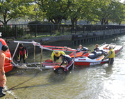 S.C.T.Mユニットで水上オートバイと連結することで、入り組んだ水面や狭い水路でも思い通りの操縦が可能となります。また、一般的な水上オートバイは水深約60cmで走行が可能ですので、救助活動の幅が広がります。
