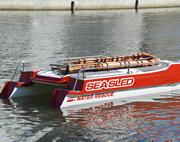 水上オートバイに連結させる船体を双胴船(カタマラン)にすることで、水上オートバイのウォータージェット水流の影響を受けることなく安定した走行が可能になりました。双胴船は左右に揺れるロールに対して安定性が非常に高く、デッキ上で安全に救助活動を行うことができます。