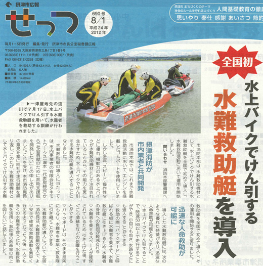 水都大阪フェス2012で、摂津市消防本部レスキュー隊とシーバードよどがわとの合同水難救助訓練を開催しました。